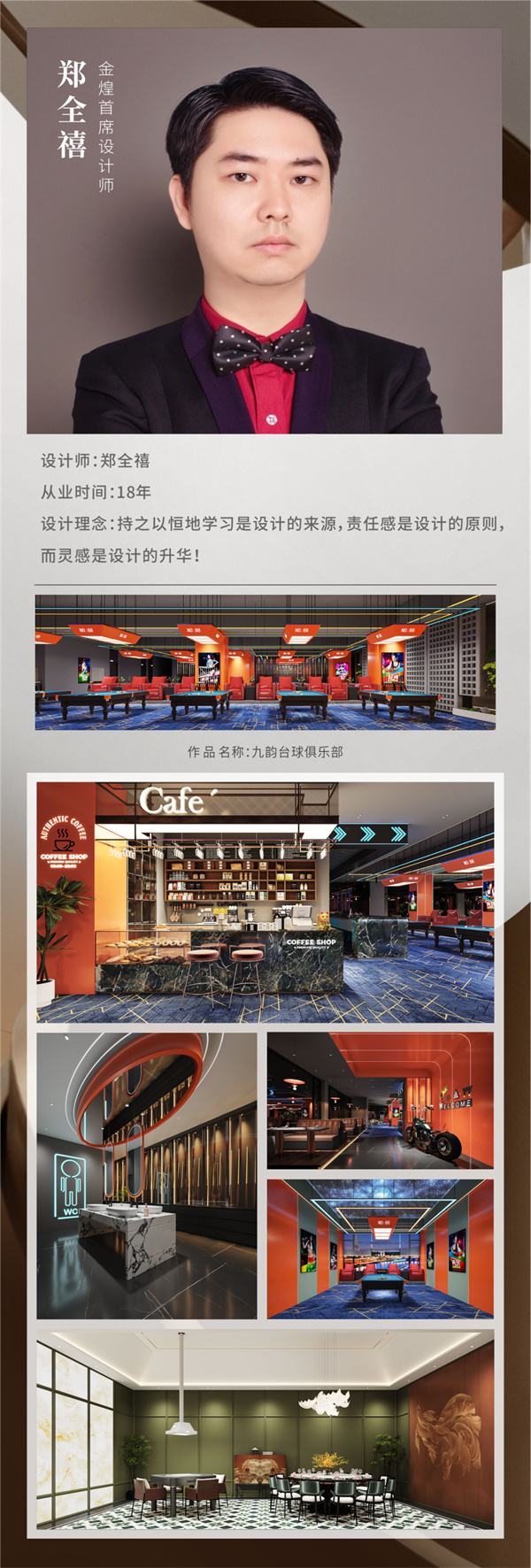 本次大賽以“綠色瀟湘·幸福湖南”為主題,金煌設(shè)計(jì)總監(jiān)丁國成設(shè)計(jì)的住宅項(xiàng)目《自然之風(fēng)》,金煌TOP設(shè)計(jì)院孫潔設(shè)計(jì)的麓云國際別墅項(xiàng)目獲得金獎(jiǎng);金煌首席設(shè)計(jì)師鄭全禧設(shè)計(jì)的會所項(xiàng)目九韻臺球俱樂部獲得銅獎(jiǎng);孫潔設(shè)計(jì)的住宅項(xiàng)目《映?槿》獲得優(yōu)秀獎(jiǎng)。橙果墅裝主理人孫香設(shè)計(jì)的住宅項(xiàng)目《幽幽歲月》獲得金獎(jiǎng),《明暗至簡》獲得銅獎(jiǎng)。金煌也喜獲優(yōu)秀組織獎(jiǎng)。
