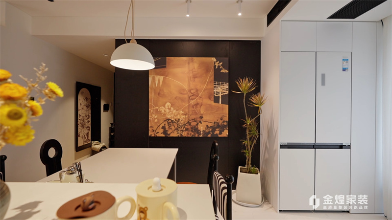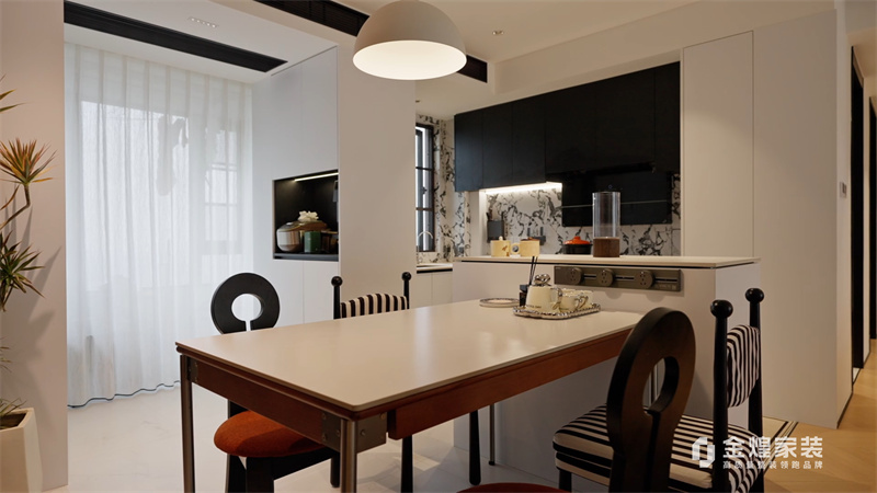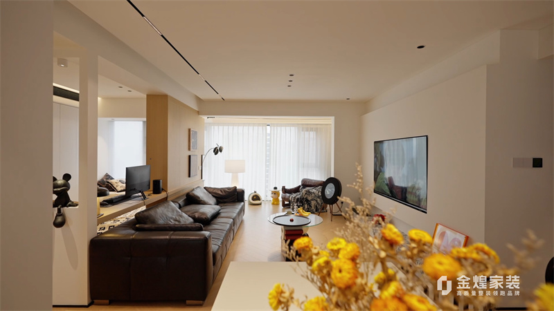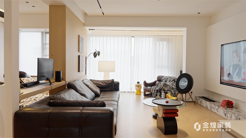 這套案例是現(xiàn)代中古混搭風(fēng)格。整體色調(diào)以淺色為主,搭配深色家具,營造出簡潔而不失溫馨的氛圍??蛷d的布局開闊,沙發(fā)、茶幾和電視的擺放合理,既美觀又實用。