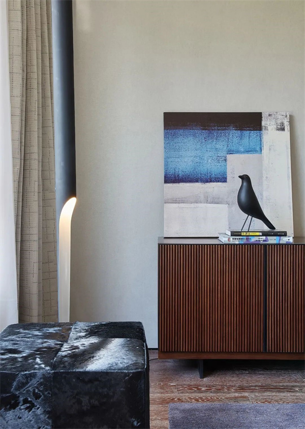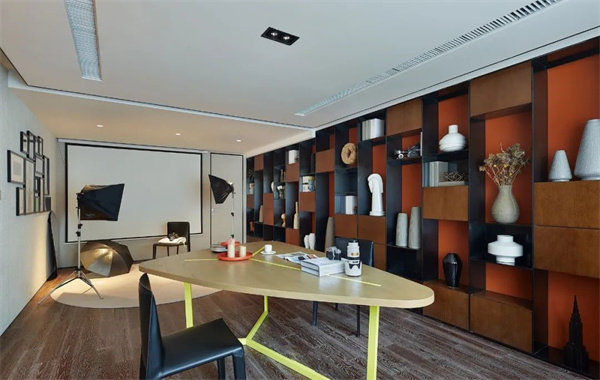 走進(jìn)書(shū)房,被一整排書(shū)柜所吸引,大量藝術(shù)擺件展示主人品味與藝術(shù)素養(yǎng)。加上大量使用的橙色元素,使整個(gè)空間更加充滿活力和生機(jī),每一處細(xì)節(jié)都在呼應(yīng)著整體的設(shè)計(jì)理念,既獨(dú)具特色又不失和諧統(tǒng)一。