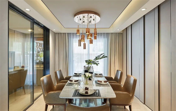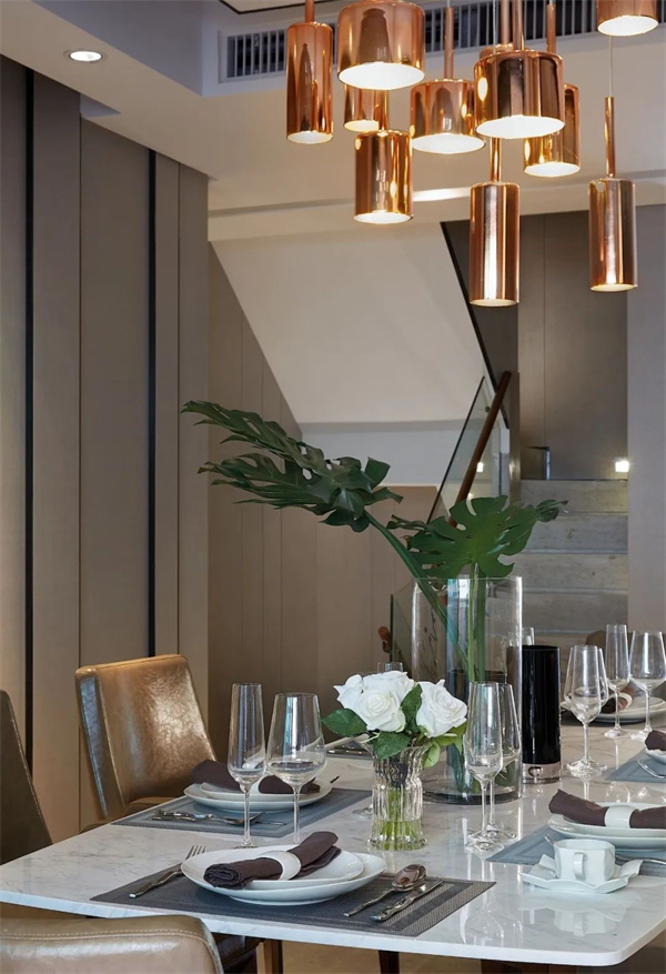 隨著空間動(dòng)線進(jìn)入餐廳,皮藝餐椅與亮色大理石餐桌的搭配,輕松營(yíng)造出輕奢優(yōu)雅的氛圍,加上線型黃銅吊燈的運(yùn)用,讓空間既有精致氣息又不失溫潤(rùn)質(zhì)感。