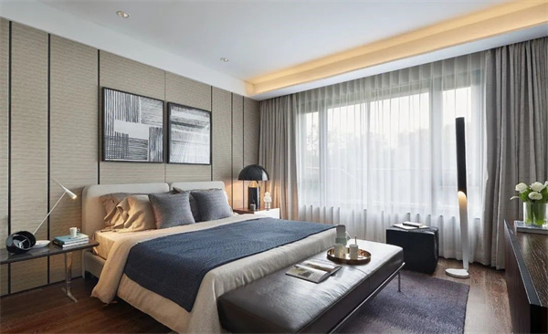床頭兩側(cè)各配以一盞柔和的燈光,營(yíng)造出私密且寧?kù)o的閱讀空間。窗簾選用輕薄的布料,自然的光線透過(guò)窗戶灑進(jìn)房間,與淺色墻面相映成趣,給人一種清新明亮的感覺(jué)。