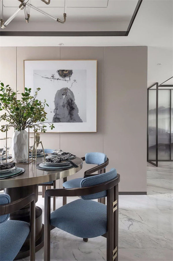 新中式餐廳布置,以天然材料的運(yùn)用、色彩搭配的細(xì)致處理以及家具的精心選擇,使餐廳呈現(xiàn)出舒適、高品質(zhì)的用餐環(huán)境。背景墻上掛上一幅古韻山水畫,增加空間質(zhì)感,充滿了禪意的韻味。