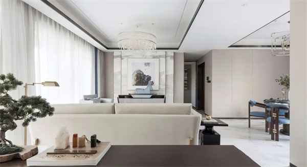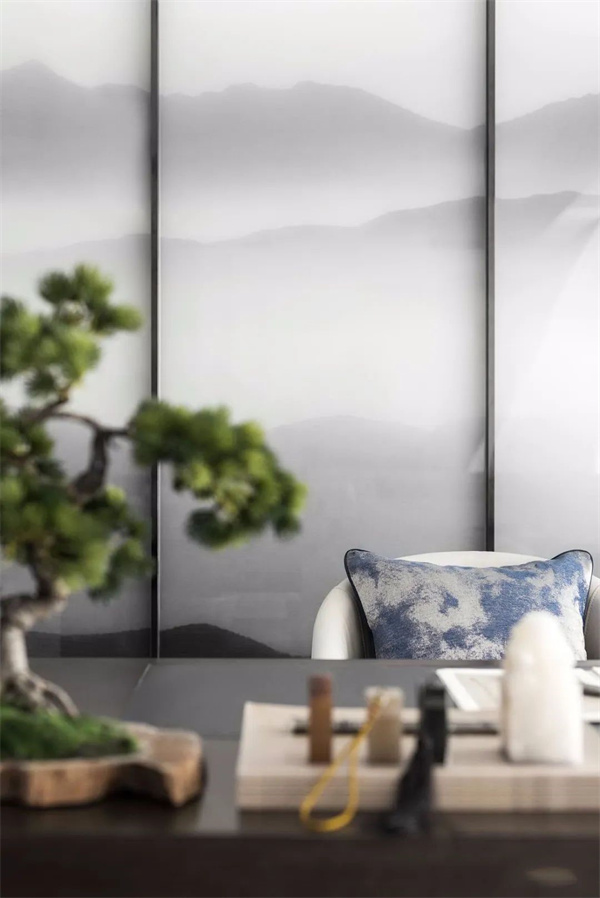 沙發(fā)墻在硬包基礎(chǔ)上加入詩意背景畫面,搭配新中式的沙發(fā),側(cè)邊配上坐椅、盆栽綠植的布置,使得整個(gè)客廳充滿著儒雅端莊的氛圍氣息。