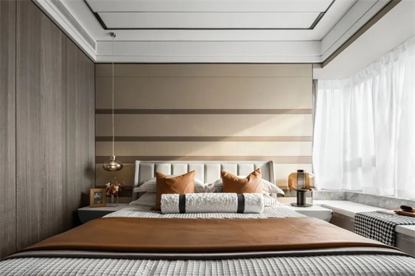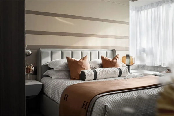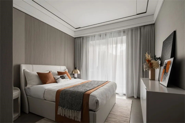主臥色調(diào)以柔和的灰白為主,帶來寧靜而舒適的氛圍。床頭靠背采用暖色的軟包設(shè)計(jì),簡潔卻極具質(zhì)感,與木色邊柜形成和諧的對(duì)比。超大窗戶帶來卓越的自然采光條件,同時(shí)擴(kuò)大了空間的視覺效果,為房間注入更多的明亮和開闊感。