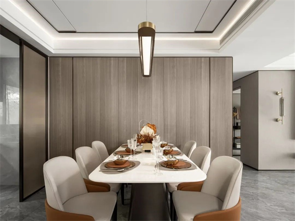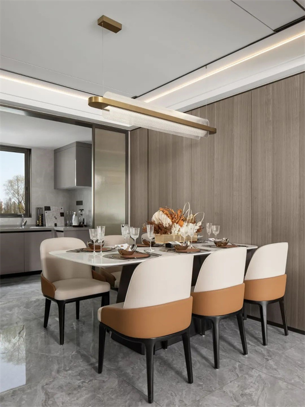 餐廳空間與客廳相連貫,整體寬度充足,居中擺放一套簡約巖板餐桌+舒適的皮藝餐椅,讓用餐氛圍輕松閑適。餐桌上的插花和素雅的餐具恰到好處地點(diǎn)綴著整體設(shè)計(jì),既保留了簡約的美感,又增添了一抹生機(jī)和活力。