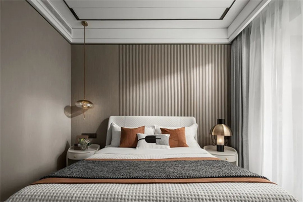 次臥設(shè)計(jì)更加輕松寫意。木飾背景墻面與白色的床品搭配出柔和的視覺效果,給人一種舒適放松的感覺。窗戶同樣帶來良好的采光效果,保持了次臥的明亮與通透,整個(gè)房間設(shè)計(jì)簡潔,卻不失溫馨與實(shí)用性。