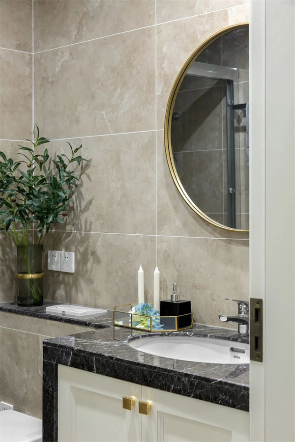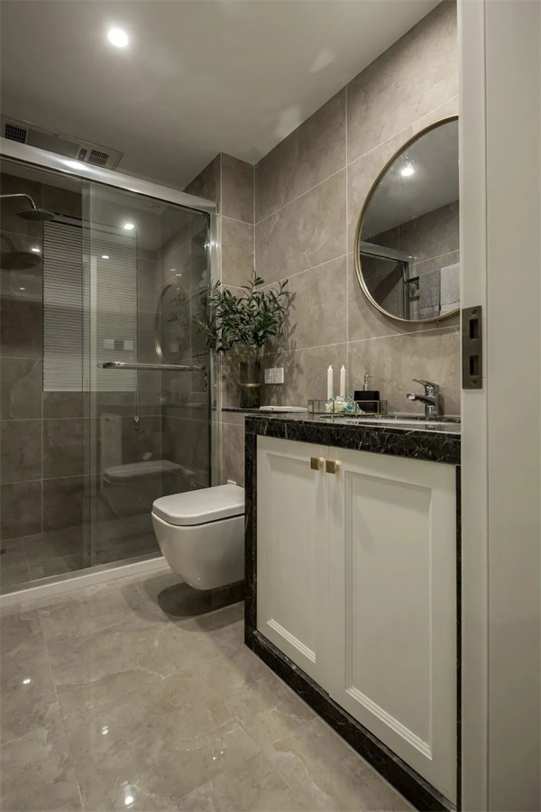 衛(wèi)生間以淺色大理石瓷磚裝飾,金屬邊框的鏡面與精致的洗漱臺(tái)相映成趣,在燈光的映襯下透出高級(jí)感。玻璃淋浴隔斷,讓空間更顯通透,打造出一個(gè)舒適放松的洗浴空間。