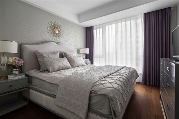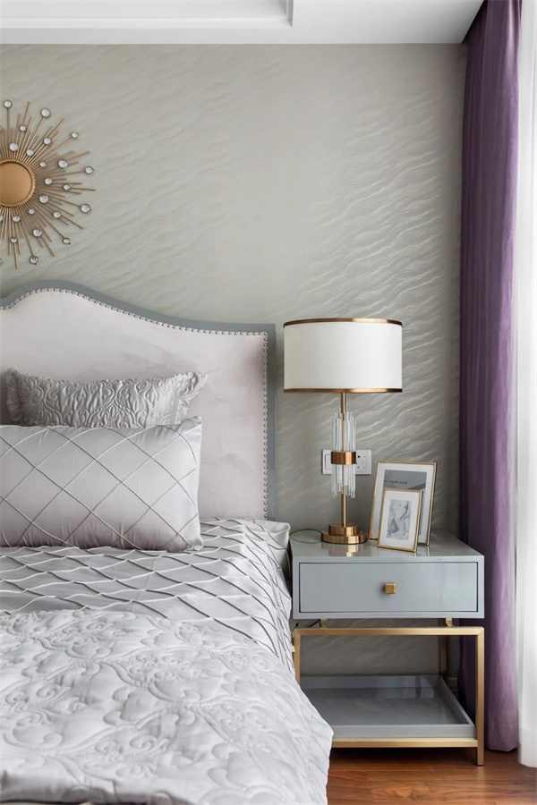 次臥以柔和的中性色調(diào)為主,搭配精致的金屬線條和獨(dú)特的軟包床頭,營(yíng)造出優(yōu)雅高級(jí)的溫馨氛圍。大面積的落地窗引入充足的自然光,窗簾則選用輕盈的絲質(zhì)材質(zhì),增強(qiáng)通透感和舒適度,賦予空間獨(dú)特的優(yōu)雅氣質(zhì)。