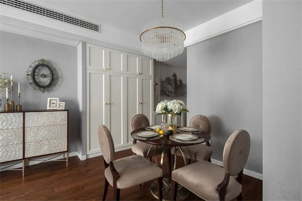 餐廳原木餐桌與布藝餐椅搭配精致的金屬吊燈,使餐區(qū)充滿現(xiàn)代感。餐邊柜上擺件和藝術(shù)鐘作為點(diǎn)綴,讓整個(gè)空間更具藝術(shù)氛圍。餐具的選擇注重精致和品質(zhì),搭配上鮮花裝飾,既簡(jiǎn)約又不失奢華。