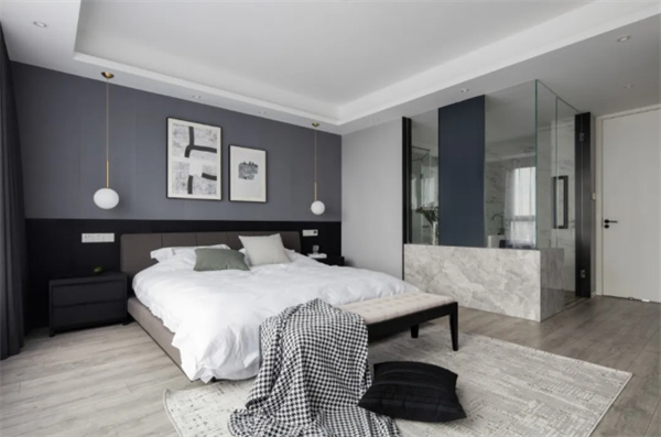 主臥室以灰色為主,地板+墻面、包括床上用品,都采用了白色和灰色的組合。床頭柜和背景是黑+灰組合,為空間增添了一些深色元素。窗簾選用了白色透明面料,確保充足的自然光線進入房間。