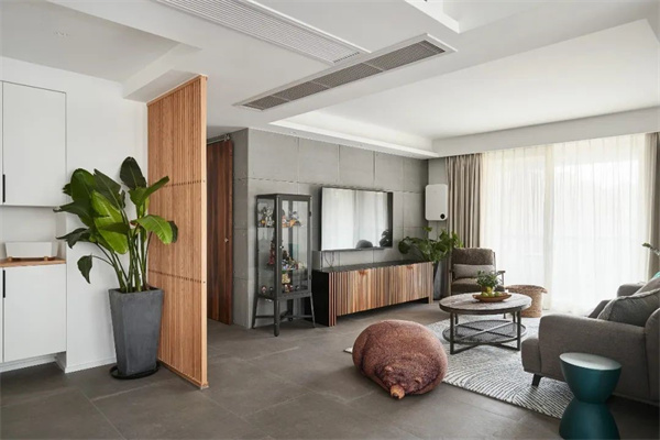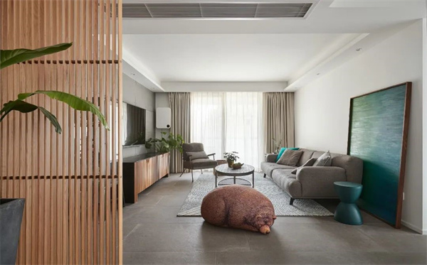 客廳白色的墻面與自然木色的家具相映襯,打造出明亮寬敞的空間。一組灰色布藝沙發(fā)與柔軟的地毯搭配,營造出舒適宜人的氛圍。