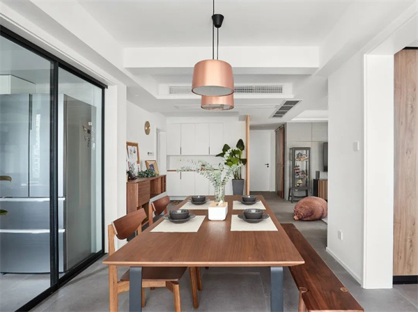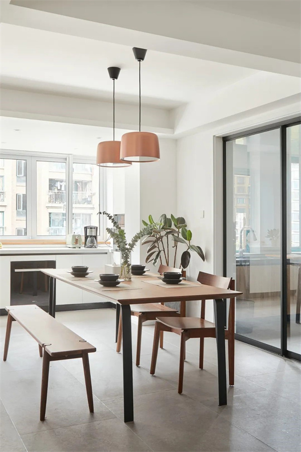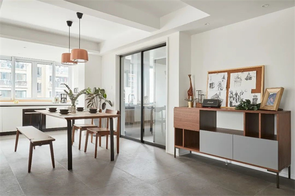餐廳的餐桌和椅子選用簡約的原木材質(zhì),強(qiáng)調(diào)自然的質(zhì)感。餐具和裝飾品注重線條簡單,營造純凈的用餐環(huán)境。燈光設(shè)計(jì)簡潔而柔和,打造出寧靜而舒適的用餐氛圍,仿佛讓人置身于北歐的自然風(fēng)光之中。