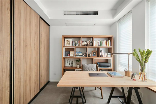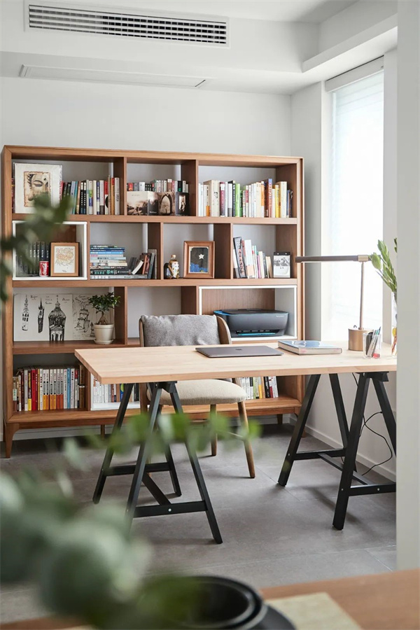 書柜上擺放著各式書籍,暖色的木質(zhì)紋理充滿生機(jī),明亮的陽光透過寬大窗戶灑在書桌上,創(chuàng)造了宜人的學(xué)習(xí)環(huán)境。角落擺放的綠植增添生機(jī),為空間注入清新氛圍,為業(yè)主提供了思考與學(xué)習(xí)的寧靜空間。