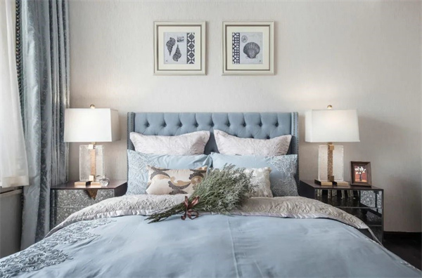 主臥中,優(yōu)雅與奢華交織成了一幅夢幻的畫卷。房間的主色調(diào)為柔和的米白色和天藍(lán)色,床頭采用軟包設(shè)計,床上鋪設(shè)著絲綢質(zhì)地的天藍(lán)色床品,柔軟而光滑的觸感讓人沉醉其中,與花卉相互輝映,彰顯出典雅與細(xì)膩。