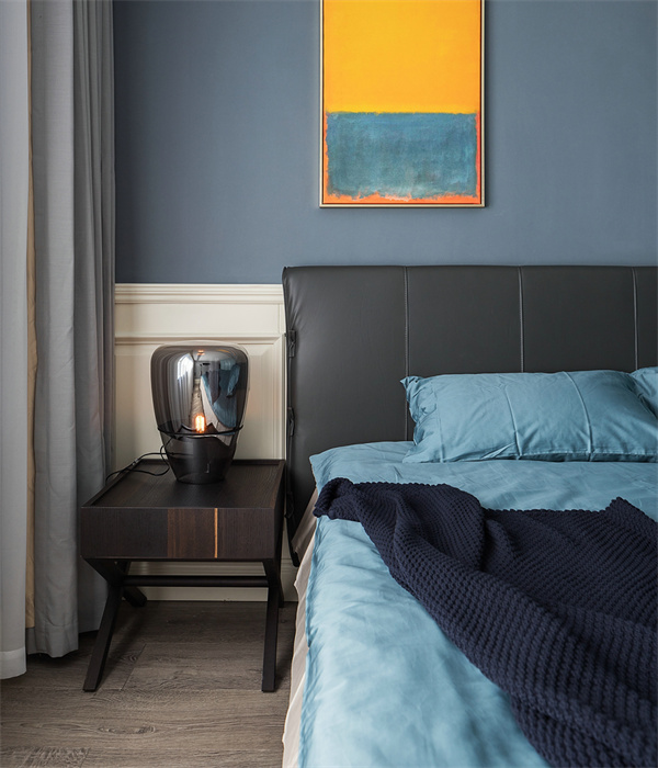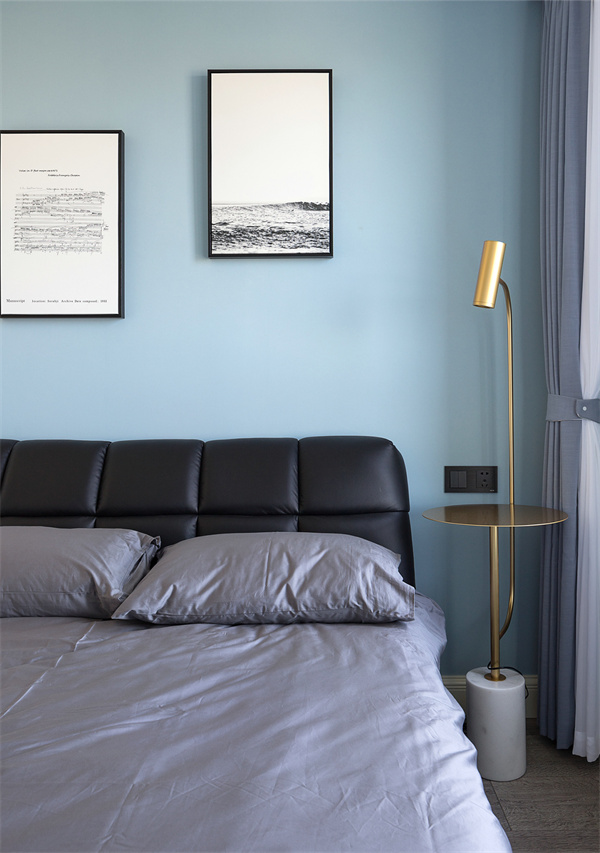 主臥采用時尚的設計語言,白色和淺灰色墻面搭配木色地板,突顯整體空間的清新與寬敞感。床品選擇了高質感的純棉,搭配一些柔和的裝飾枕營造出溫馨的氛圍,簡約的床頭柜和燈具設計,為主人帶來舒適輕松的睡眠空間。