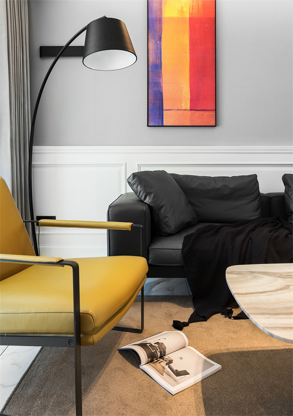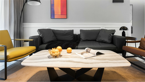 客廳主色調采用灰白墻面與白色大理石地磚搭配,創(chuàng)造出通透明亮的空間感。以低調的深色調沙發(fā)展現簡約品味,通過精致的極簡設計裝飾畫和空間擺件,為整個客廳注入一絲藝術氛圍。