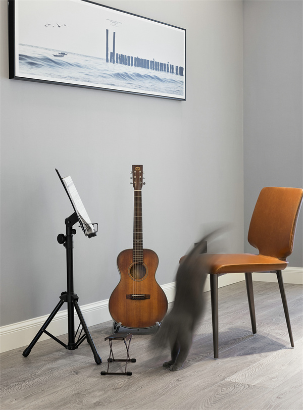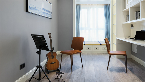 書房注重實用性和整體協調性。以純白書桌和書架組合,打造出一個明快而整潔的學習空間。舒適的椅子、明亮的臺燈,以及簡約的掛畫與樂器,讓這個空間兼具工作與休閑的功能。