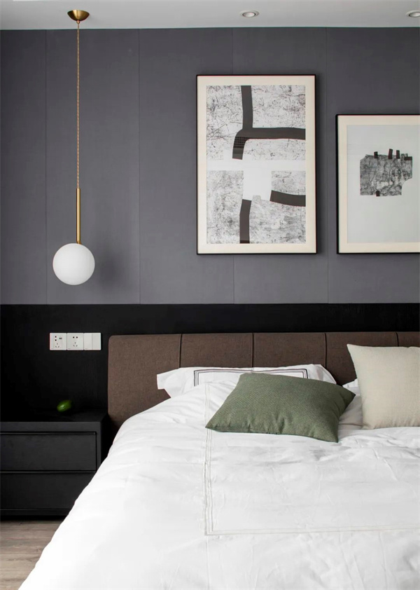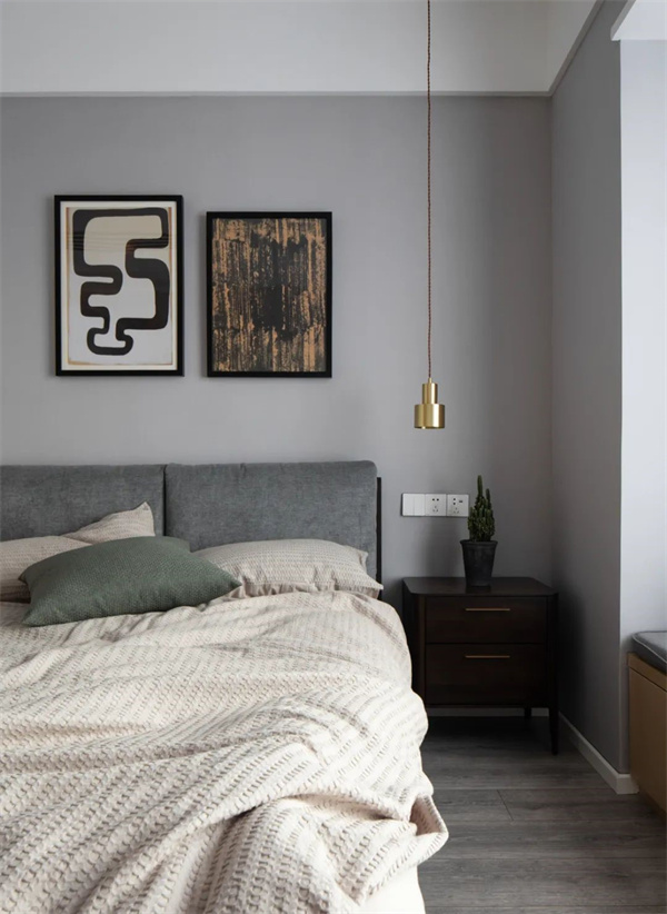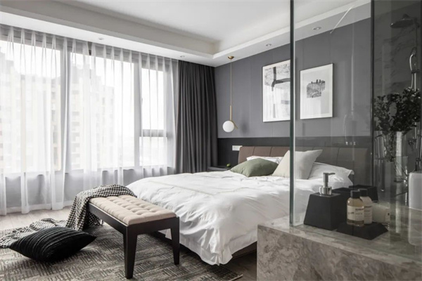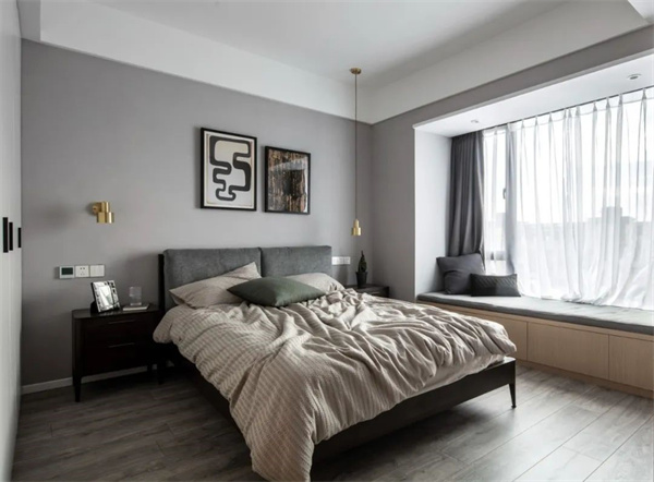 主臥室以灰色為主,地板+墻面、包括床上用品都采用了白+灰組合。床頭柜和背景的灰黑組合,為空間增添了一些深色元素。窗簾選用了白色透明面料,確保充足的自然光線進(jìn)入房間。