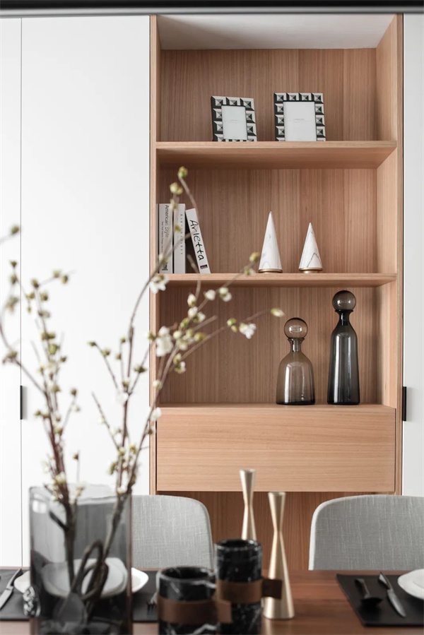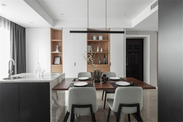 餐廳采用了原木色餐桌和現(xiàn)代風(fēng)格的椅子,椅背采用灰色織物為用餐區(qū)增添了舒適感。頂部懸掛著精致的吊燈,為用餐區(qū)提供柔和的照明。餐邊柜裝飾著一些抽象藝術(shù)作品,為空間增添了一抹藝術(shù)感。
