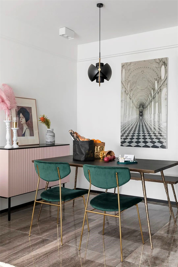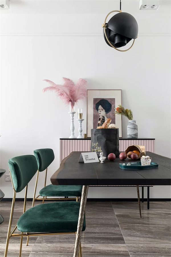 餐廳以深色木質(zhì)餐桌搭配綠色絨面椅子,既現(xiàn)代又不失溫暖。金色的椅腿與黑色吊燈相呼應(yīng),增添了幾分奢華感。墻上的藝術(shù)畫作為整個(gè)空間注入的藝術(shù)氛圍,柔和的光線和精心布置的細(xì)節(jié),讓每一次用餐都成為一種享受。
