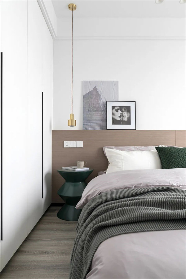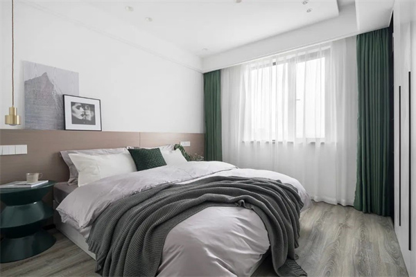 主臥仿佛寧?kù)o而舒適的避風(fēng)港。床頭的木質(zhì)背景墻搭配簡(jiǎn)約的裝飾畫,既現(xiàn)代又不失自然氣息。綠色的窗簾和灰色的毛毯為整個(gè)空間增添了幾分清新與溫馨,精心布置的細(xì)節(jié)和柔和的色調(diào),營(yíng)造出一種溫暖而放松的氛圍。