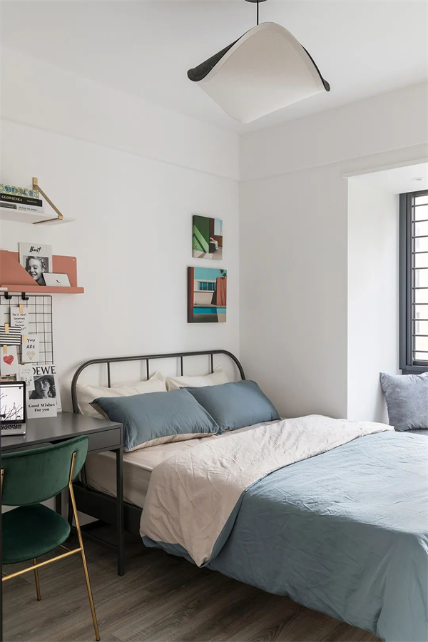 次臥延續(xù)北歐風(fēng)格的簡(jiǎn)約設(shè)計(jì),以淡雅的藍(lán)色為主,簡(jiǎn)潔的家具搭配柔軟的床品,為房間增加了溫馨感。窗戶保持通透,利用自然光線,讓整個(gè)房間更具層次感。