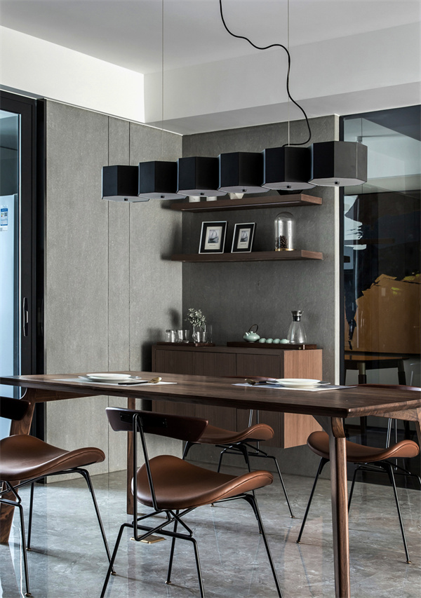 餐廳以簡潔的桌椅設(shè)計為主,原木餐桌搭配時尚皮質(zhì)餐椅,創(chuàng)造出輕松宜人的用餐氛圍。獨特設(shè)計的吊燈成為視覺焦點,突顯現(xiàn)代感,整體設(shè)計追求空間感和開放感,用餐成為一種令人愉悅的體驗。