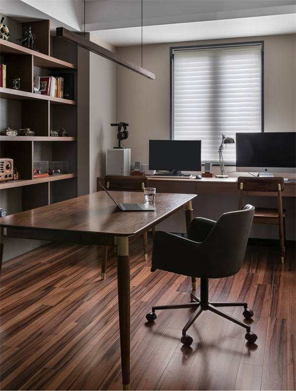 書房以簡約的書桌、書柜搭配舒適的椅子,為讀書工作提供良好的環(huán)境。簡潔書架和藝術(shù)品裝飾,呼應(yīng)現(xiàn)代風(fēng)格。充足的自然光線和人性化的照明設(shè)計,使書房成為思考和學(xué)習(xí)的理想場所。