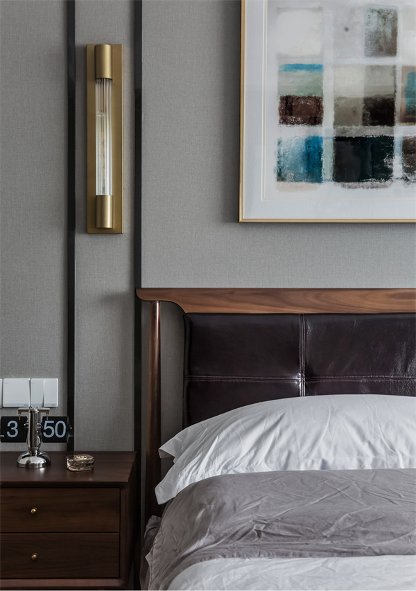 主臥以舒適為設(shè)計核心。選擇原木色地板、灰白色墻面等柔和的色彩床品和家具,注重舒適度和簡約美感。窗簾選用輕薄的材質(zhì),讓自然光線充分滲透。床頭背景墻個性化的裝飾品和一組獨特設(shè)計壁燈,為主臥空間增添一份溫馨和藝術(shù)感。