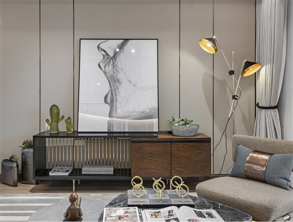 本案采用灰白中性色搭配原木地板為主色調(diào),營(yíng)造清新簡(jiǎn)約的空間氛圍。室內(nèi)家具選用了簡(jiǎn)約設(shè)計(jì)的灰白色系,搭配金屬材質(zhì)的細(xì)節(jié)裝飾與綠植,使整體空間更顯現(xiàn)現(xiàn)代感和奢華感。