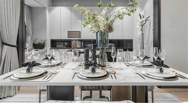 餐廳延續(xù)客廳的風(fēng)格,將定制柜的美觀與實(shí)用性發(fā)揮得淋漓盡致。現(xiàn)代感十足的燈具將溫暖的光線投射到大理石餐桌和布藝餐椅上,營(yíng)造出舒適的用餐氛圍。開闊的陽臺(tái)風(fēng)格和清新的綠植更是為餐廳增添自然美景。