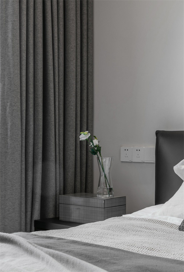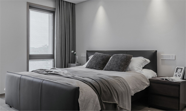 主臥室以木色地板搭配灰白墻面,包括床上用品都采用了白色和灰色的組合。黑色的床與床頭柜,為空間增添了一些深色元素,窗簾在整體灰調(diào)的基礎(chǔ)上加入白色透光面料的紗簾,確保充足的自然光線進入房間。