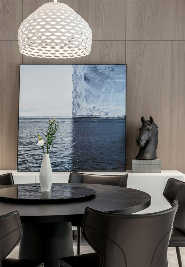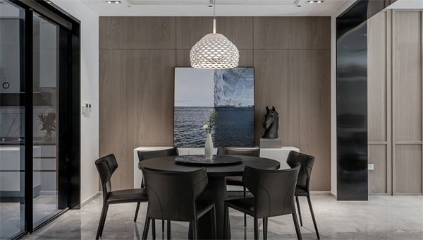 餐廳采用了深色餐桌椅,灰色大理石地磚搭配墻壁上的木色飾面,為用餐區(qū)增添舒適感。頂部懸掛著精致的吊燈,提供柔和的照明。餐邊柜裝飾著抽象藝術(shù)畫,為空間增添一抹現(xiàn)代藝術(shù)感。