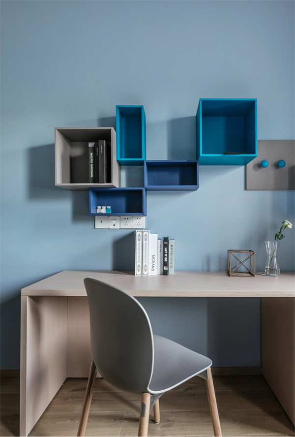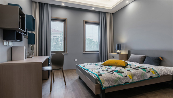 次臥以淡灰色為主色調(diào),營造出寧靜的氛圍。墻面和窗簾都是白色+淡灰色組合,一張簡約而舒適的雙人床與原木書桌,和木色地板相配,增添了自然質(zhì)感。