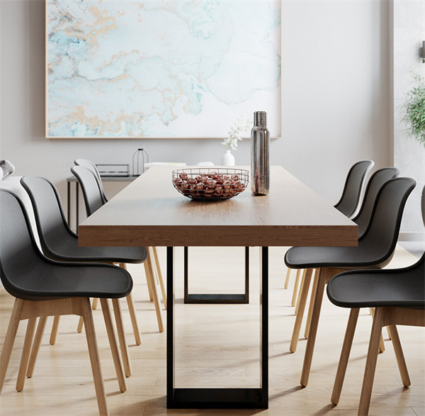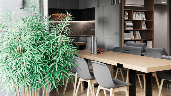 原木餐桌和椅子在餐廳中獨(dú)具焦點(diǎn)。天然的木紋質(zhì)感+綠色盆栽景觀,散發(fā)著獨(dú)特的自然之美。吊燈采用長條的深灰色金屬設(shè)計,餐邊柜搭配大幅的掛畫設(shè),使空間更富藝術(shù)感和美感。