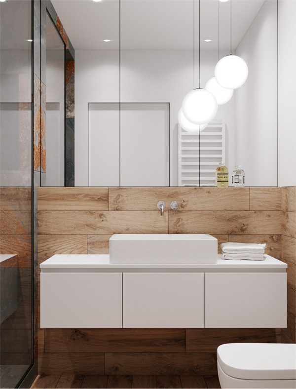 衛(wèi)生間使用仿木色墻磚與白色定制柜,和大面積鏡框形成和諧搭配。地面使用一體化的原木紋瓷磚,不僅美觀而且易于清理。柔和的燈光烘托出溫馨的氛圍,讓人在沐浴時感受到自然的寧靜。