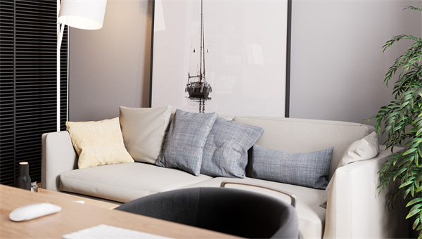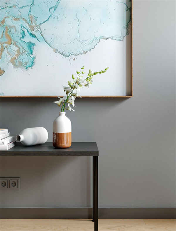 客廳以大面積原木色和灰白色相結(jié)合,搭配清新自然且線條簡潔的家具,再以原木色地板匹配一組灰色布藝沙發(fā),打造寬敞明亮的氛圍,加上墻上裝飾著藝術(shù)掛畫,為空間增添了一份雅致的藝術(shù)感。