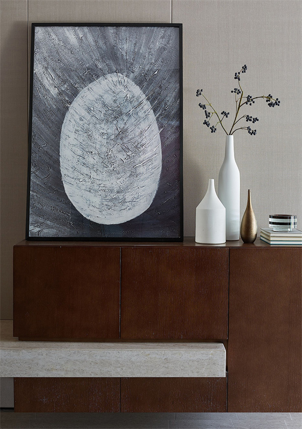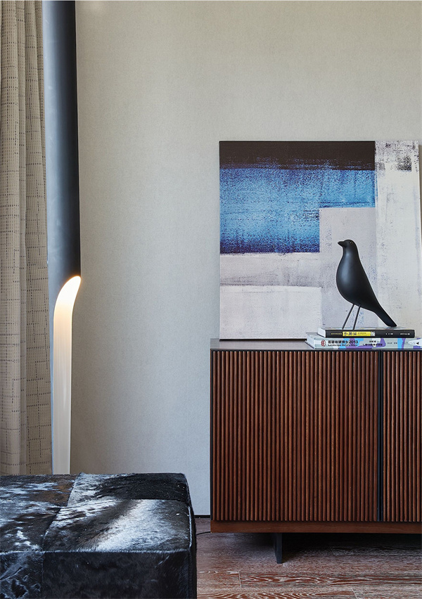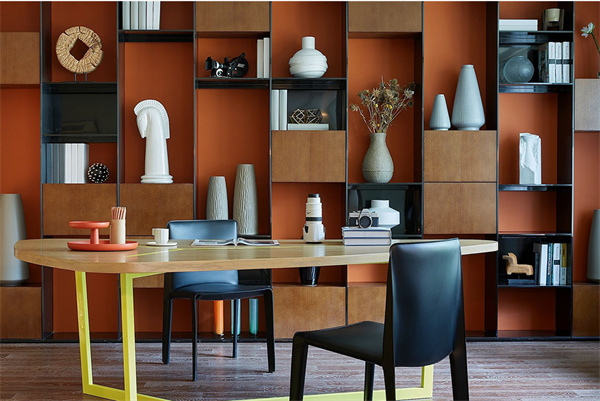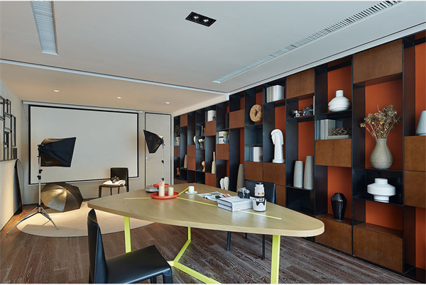 走進(jìn)書(shū)房,被一整排書(shū)柜所吸引,大量藝術(shù)擺件展示主人品味與藝術(shù)素養(yǎng)。加上大量使用的橙色元素,使整個(gè)空間更加充滿活力和生機(jī),每一處細(xì)節(jié)都在呼應(yīng)著整體的設(shè)計(jì)理念,既獨(dú)具特色又不失和諧統(tǒng)一。