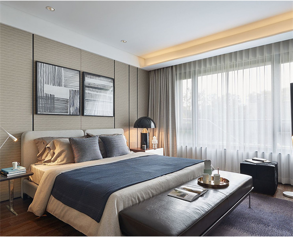 床頭兩側(cè)各配以一盞柔和的燈光,營(yíng)造出私密且寧?kù)o的閱讀空間。窗簾選用輕薄的布料,自然的光線透過(guò)窗戶灑進(jìn)房間,與淺色墻面相映成趣,給人一種清新明亮的感覺(jué)。