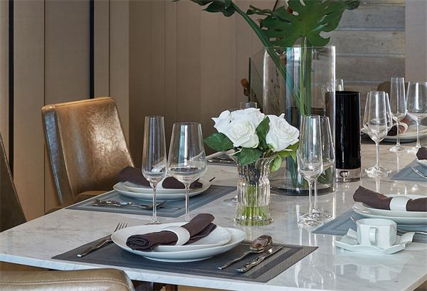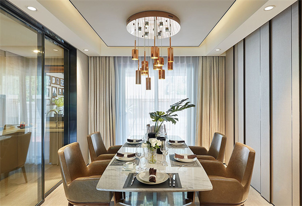 隨著空間動(dòng)線進(jìn)入餐廳,皮藝餐椅與亮色大理石餐桌的搭配,輕松營(yíng)造出輕奢優(yōu)雅的氛圍。加上線型黃銅吊燈的運(yùn)用,讓空間既有精致氣息又不失溫潤(rùn)質(zhì)感。