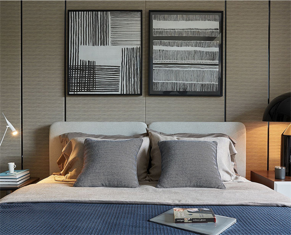 臥室床頭墻是軟質(zhì)的布藝靠背,整體以灰、白色為基調(diào),加入一組布藝畫(huà)點(diǎn)綴,帶來(lái)溫暖而又優(yōu)雅的氛圍。床品選用了高品質(zhì)的純棉面料,柔軟舒適,令人沉浸在舒適的睡眠中。