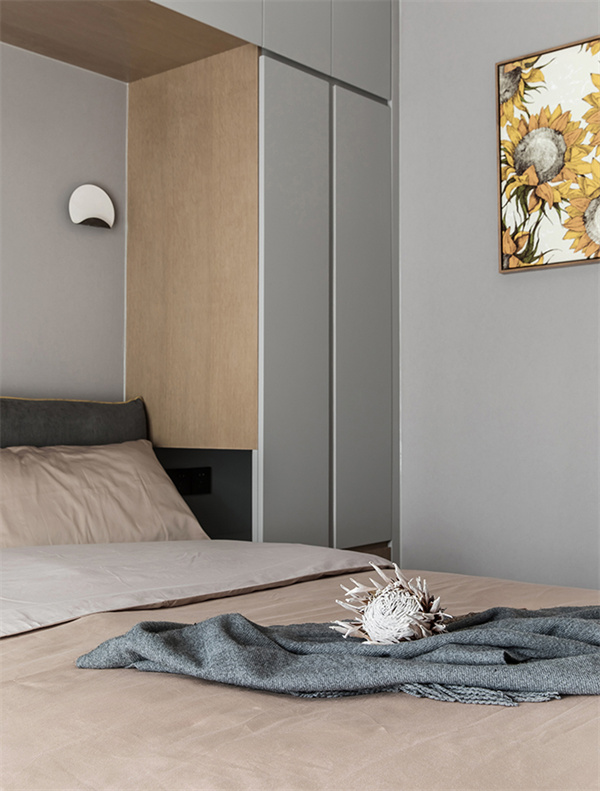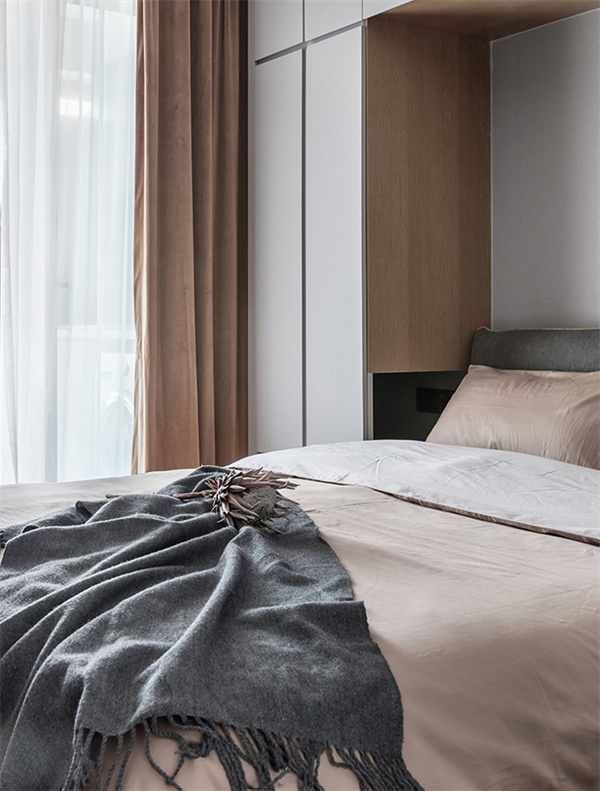 次臥延續(xù)整體風(fēng)格,以白色為主色調(diào),營(yíng)造出寧?kù)o的氛圍。墻面和窗簾都是白色+淡灰色組合,一張簡(jiǎn)約而舒適的雙人床與整套原木床頭柜設(shè)計(jì)相配,增添了自然質(zhì)感。