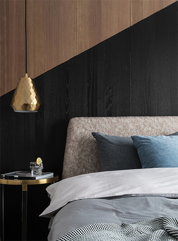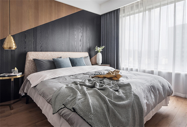 臥室整體布局簡(jiǎn)潔明快,為休息提供舒適的環(huán)境,特別是原木色與黑色相拼接設(shè)計(jì)的床頭背景墻,給整個(gè)空間增添了現(xiàn)代感和品味。在優(yōu)秀的采光條件下,窗簾選用白色透明面料,確保充足的自然光線進(jìn)入房間。