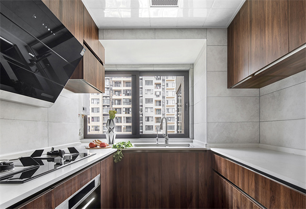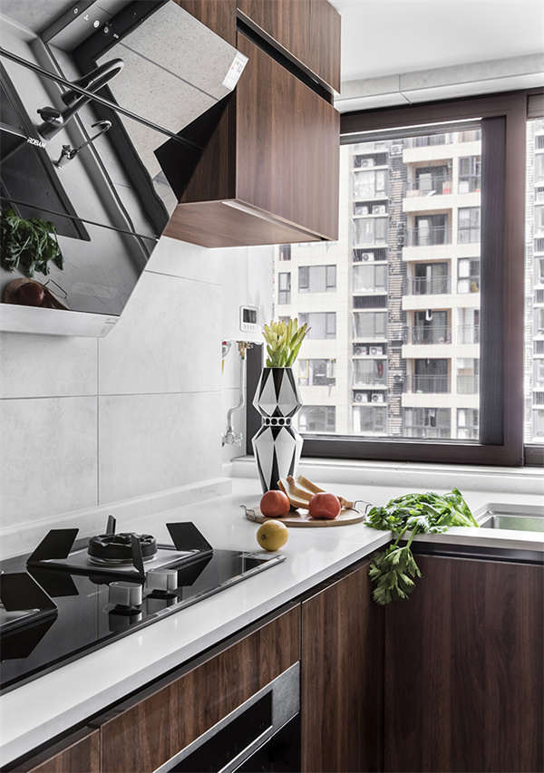 廚房采用現(xiàn)代設(shè)計(jì)的灰白+原木色搭配方案。櫥柜選用原木色柜面和白色臺(tái)面組合,搭配嵌入式電器,創(chuàng)造出極簡(jiǎn)的外觀。同時(shí),灰白組合的地磚與墻面,也為廚房空間增添了質(zhì)感。