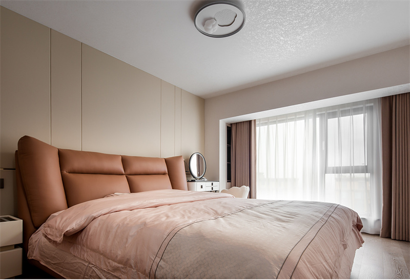 主臥采用柔和的色調(diào)與高品質(zhì)的材質(zhì)完美融合,營(yíng)造出奢華而不失溫馨的氛圍。棕色皮質(zhì)床頭板搭配細(xì)膩的床上用品,散發(fā)出濃郁的輕奢氣息。大面積的窗戶(hù)設(shè)計(jì)讓自然光線充分灑入室內(nèi),帶來(lái)明亮而舒適的視覺(jué)享受。