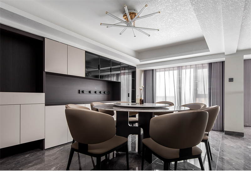 餐廳強(qiáng)調(diào)用餐空間的舒適和品質(zhì)感。精美的吊燈、壁燈,以及細(xì)致考究的餐具擺設(shè),進(jìn)一步提升了整個(gè)空間的奢華感和舒適度,打造出一個(gè)與家人和朋友共享美食的完美場(chǎng)所。