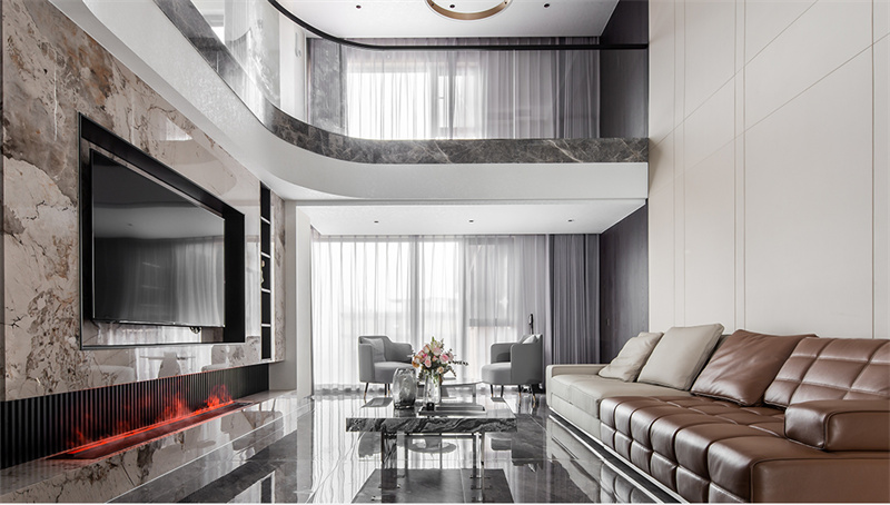 客廳以奢華和舒適為特點(diǎn),注重細(xì)節(jié)和藝術(shù)品味。大理石地板和墻壁飾面營(yíng)造出高貴的氛圍,精心挑選的藝術(shù)品、裝飾畫(huà),甚至是擺放在墻角的綠植,都彰顯了主人對(duì)生活品質(zhì)的追求和品味的獨(dú)特表達(dá)。