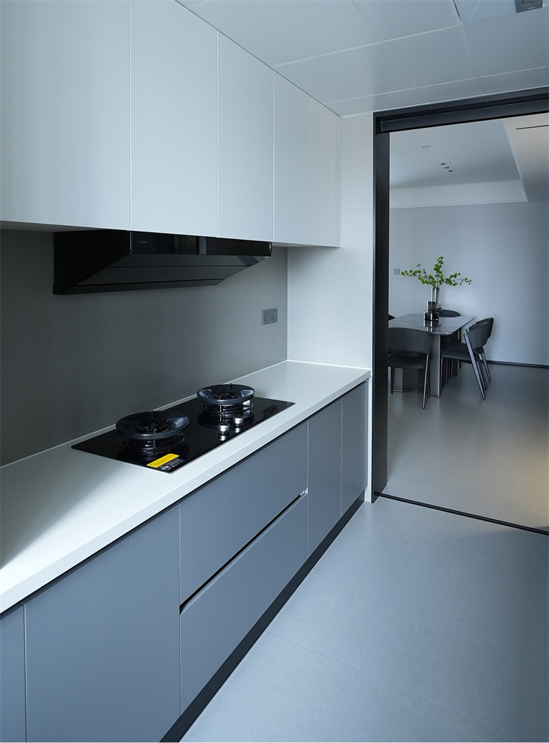廚房設(shè)計(jì)成L形的操作動(dòng)線?;野咨牡孛娲u,加上同色系的一體化定制櫥柜讓?zhuān)瑥N房顯得格外的時(shí)尚雅致。全套定制與嵌入式廚電設(shè)計(jì),更讓做烹飪空間也顯得整潔而方便實(shí)用。