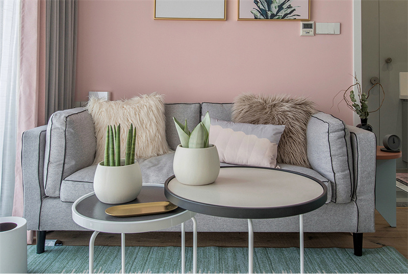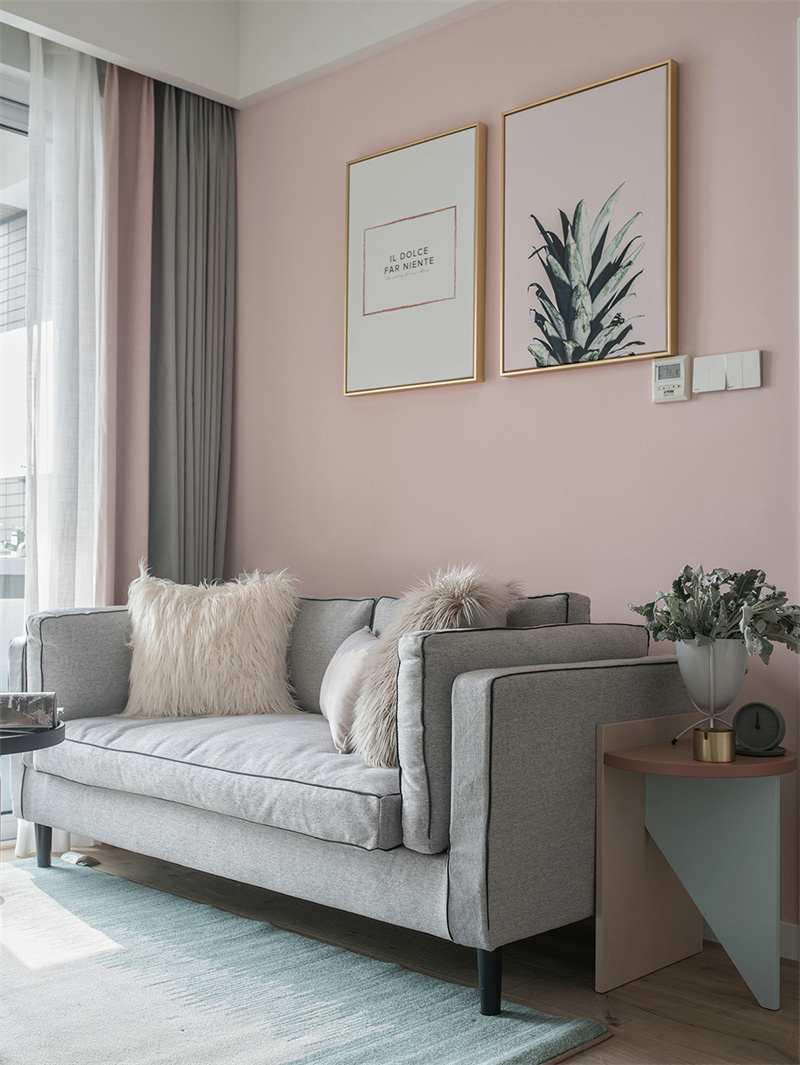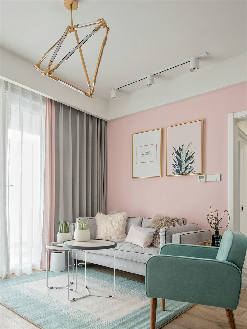 客廳墻壁采用粉色和天藍(lán)色的巧妙組合。這種色彩搭配不僅增添了空間的層次感,還帶來了一種溫暖與寧靜的對比美,兩者相互映襯,營造出一種既溫馨又清爽的視覺效果。