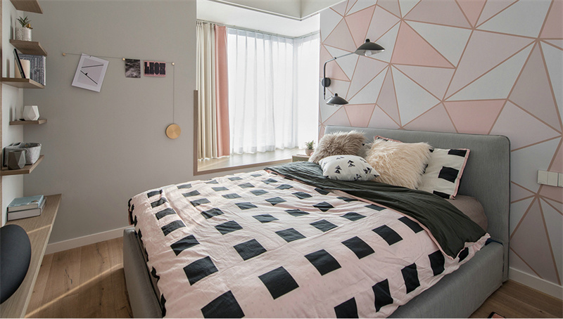 主臥背景墻采用豐富的拼色設(shè)計。原木地板、暖色床品、軟裝掛飾搭配,營造出寧靜淡雅的睡眠環(huán)境。空間整體色調(diào)偏暖色調(diào)設(shè)計,簡約溫暖舒適床頭的小臺燈在夜晚照亮屬于自己的小天地。